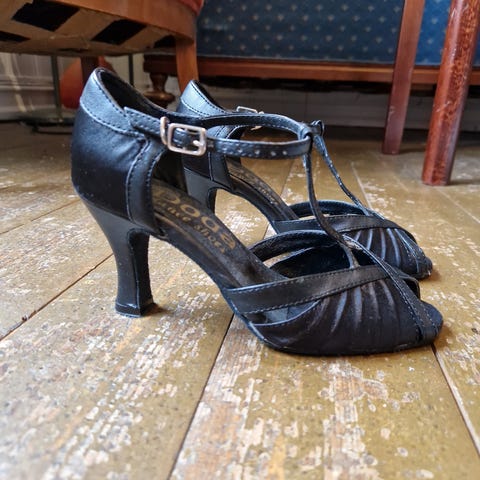Nye svarte selskapssko i str 38 selges 100,- + frakt. Skoene har gullmønster og 8cm hel