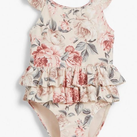 "En jumpsuit i luftig, vevd kvalitet med trykt mønster og korte sommerfuglermer. Trykk-knapper på den ene skulderen. Jumpsuiten er markert i midjen med elastikk og sløyfe. Sidelommer og elastikk nederst på bena.