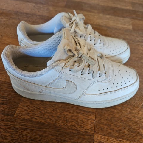 Selger ett par hvite Nike AF1. Størrelse 38. Er nokså slitte, og sålen har gulnet. Ødelagt i hælen, se bilde.