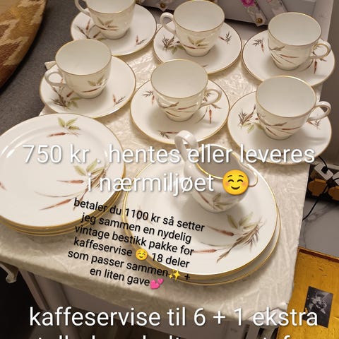 1 200 krkaffeservise selges. 12 stk av kaffekopper, kaffetallerkner og kaketallerkner.NannestadLegg til som favoritt.
