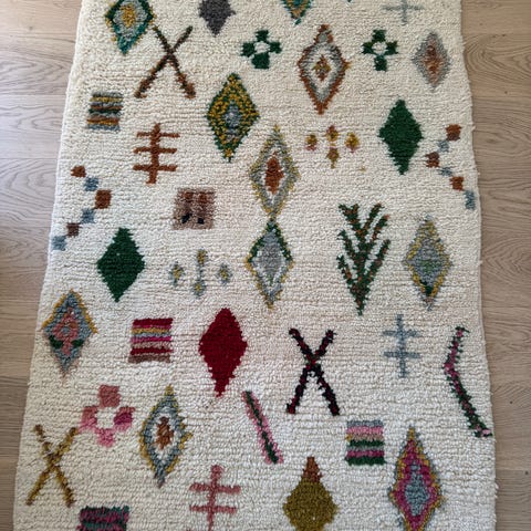 Marokkansk boujaad, ull på ull. Nylig kjøpt i Marrakech, lite brukt. 160 x 102 cm.