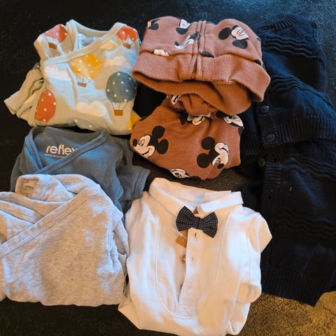 Liten klespakke med 2 hvite bodies til nyfødte, størrelse 50 og 56 selges.