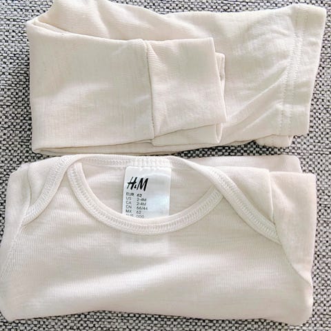 Liten klespakke med 2 hvite bodies til nyfødte, størrelse 50 og 56 fra H&M.