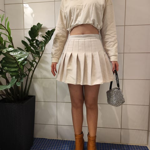 Tøft skjørt fra Pulz Jeans, style Rosita skirt, i varm beige str. M. God strech. 65% bomull. Skjørtet har knapper i front, lommer på sidene, beltehemper. Har lagt det litt ned for lengre lengde. Ble finere synes jeg. Kan sendes. Kjøper betaler frakt.