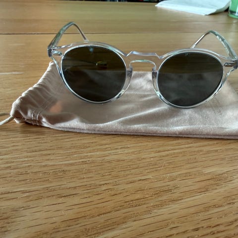 Farge: brune med blank/gjennomsiktig innramming rundt selve glassene.
