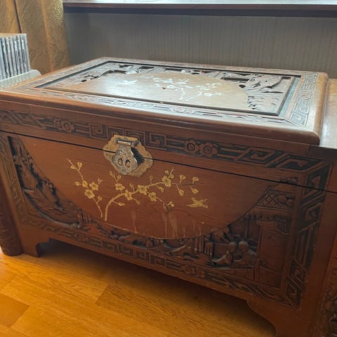 Lekker gammel reisekiste med nydelige utskjæringer. Solid.