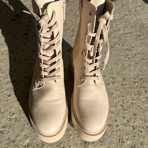 Tøffe boots i mykt skinn. Skoene er godt, men pent brukt. Har bruksmerker og litt sverte fra olabukse. Dette kan nok fjernes med skinnrens. Str. 38.
