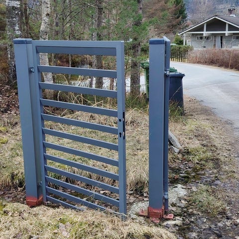 Metallgrind med portstolper i betongfundament + gjerdestolper i betongfundament.