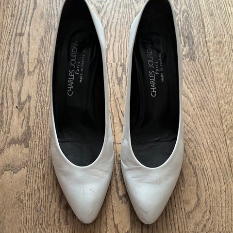 Charles Jourdan selskaps sko. Lekre, i sort skinn med stilige detaljer på hælene. Størrelse 37/38. Pent brukt, men litt slitasje, naturlig for vintage. Svært gunstig pris. Hentes Øraker Oslo, eller sendes.