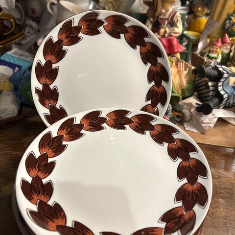 4 hele og pene asjetter i serien Stolt Margit fra Stavanger flint. Mål 20-20 cm. Alle 4 selges for 100,- Sender post. Har fat ute også.