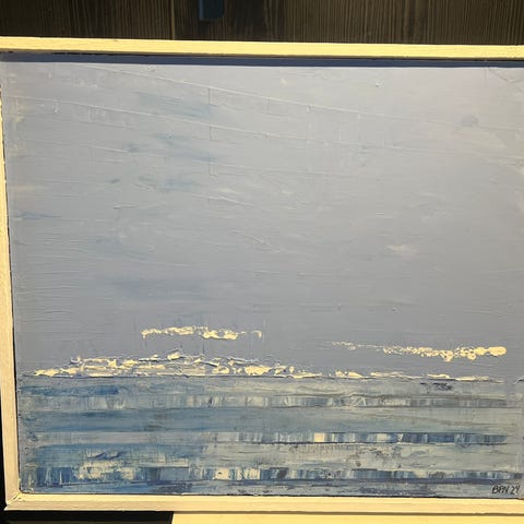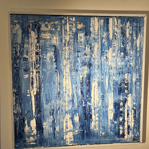 Bilde tittel ”Sommer i Bohuslän” malt i acryl/paste på lerret størrelse 62x62 cm i enkel hvit treramme… for salg.
