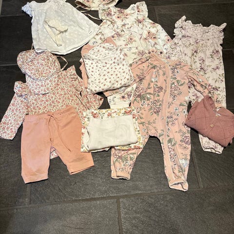 Kjempefine og pent brukte klær fra Newbie str 68. Brukt til to barn. En hvit body med svak flekk og en bukse med noen bittesmå prikker. Ellers hele og fine klær uten anmerkninger Forøvrig.