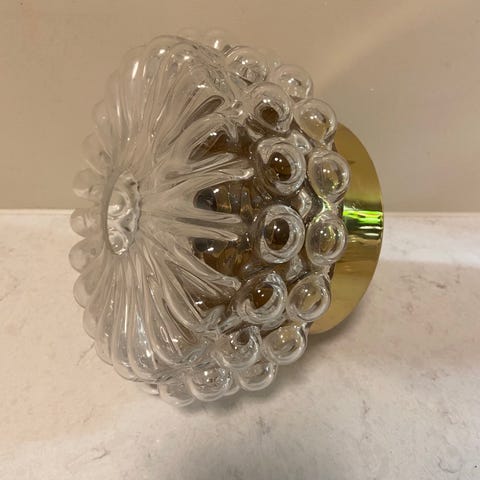 To store og tunge Space Age vegglamper i tykt strukturert pressglass. Produsert i Tyskland, ca 60 tallet. Disse vil se fantastiske ut enten som tak- eller veggmonterte lamper. Lampene har blitt fullstendig overhalt med nye sokler og nytt ledningsopplegg. Glassene er i perfekt stand. Ingen nagg eller skader. Grunnet mønsteret i glassene reflekterer de lyset på en unik måte, og fremstår som vakre smykker på veggen. Disse vegglampene fungerer både med skjult og åpen ledningstilkobling. Sjekk lignende produkter i vår nettbutikk