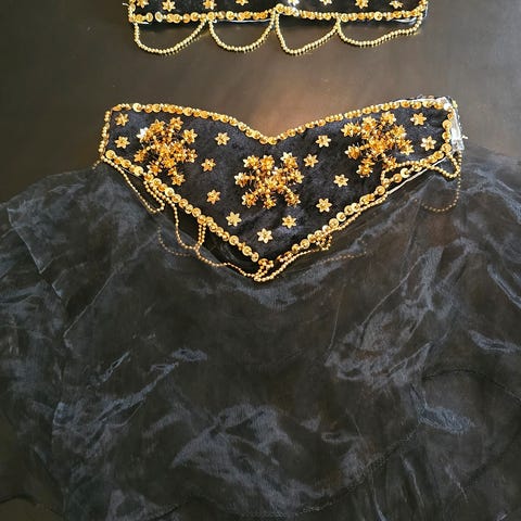 Pent brukte magedansbelter til salgs! Det svarte består av svarte paljetter og frynser, det lilla beltet er laget av fløyel med gullpaljetter og fargede stener.