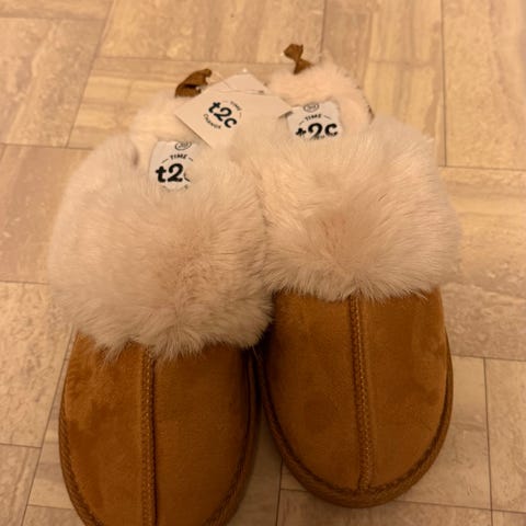 Helt nytt og ubrukt par, fortsatt i posen. Myke og varme, uten å være klamme. Ganske romslig i størrelsen, man får plass til et par sokker hvis behov. Minneskummet, som dekker hele innsiden av tøflene, er avlastende for bena, og sålen er også støtdempende.