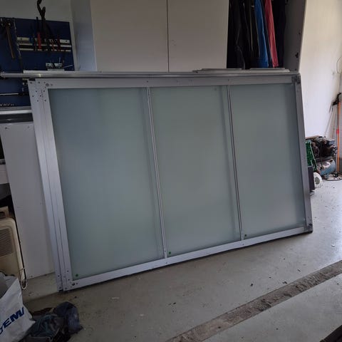 2 stk 100 cm x 236cm hvit PAX skyvedører. Dørene er delt i 2 og kobles sammen med plugger og klemmeskruer. Hver del blir da 50x236 cm. Med skinne øverst og nederst.