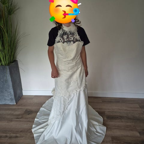 Pent brukt. Lengde fra livet og ned forran er 103 cm. Underskjørt kan leies slik at kjolen faller enda penere. Må renses. Kom gjerne og prøv den.