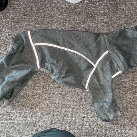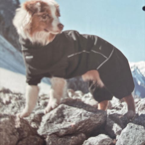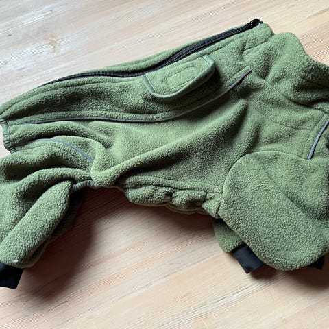 Praktisk fasong og en svart "skvettlapp" i vanntett skai-stoff under magen, som lett kan tørkes av, så man slipper å vaske hele dressen hver tur, hvis man har en hannhund som "søler" litt . Beina kan brettes opp hvis det er vått og sølete ut , f.eks på våren.
