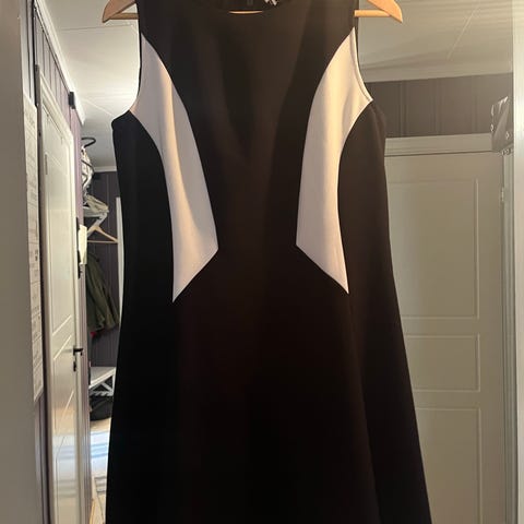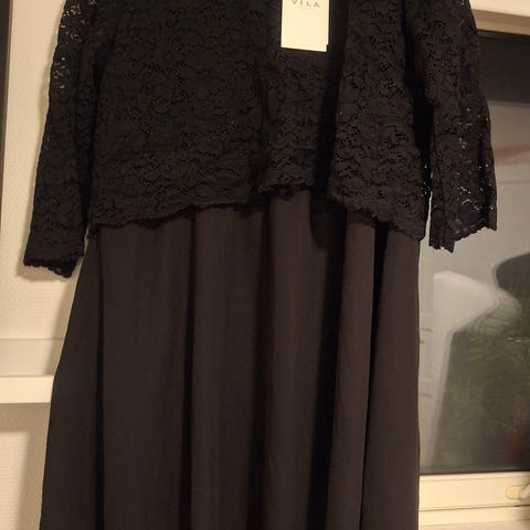 Helt ny svart kjole med fine blondedetaljer. Fasongen er "rett opp og ned", medfølgende midjebelte i stoff. Kjøpt på Zalando, glemte å sende tilbake i tide.