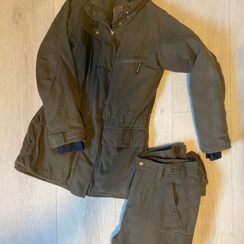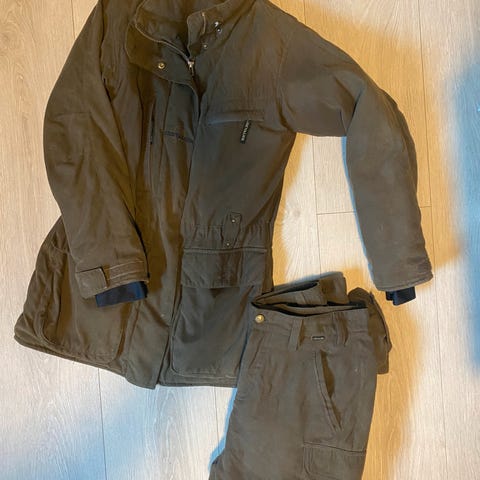 Jakke str M. Bukse str 42. Mange praktiske detaljer, som: Radiolomme, stor rygglomme, stor innerlommen m/glidelås, skinndetalj på lommer, toveis glidelås. Jakken har mesh i ryggen. Stoffet er børstet og mykt, lydløst. Perfekt for jaktturer o skogen og på fjellet. Goretex. Se bildene.
