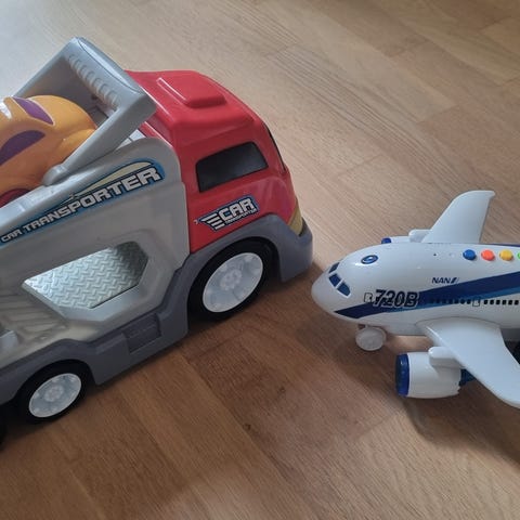 Den rød har vært lekt med. Er hel, men trenger en vask. Framhjulene går ikke rundt på den rød.