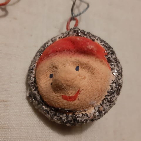 Skjønn teddy i fattigmannsølv med fine detaljer i slitt orange og crème farge med rød gammel ulltråd for oppheng.