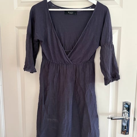 Kjole med strikk i livet og lommer foran fra Pulz selges rimelig. Nydelig, flerfarget mønster. Str. S.
