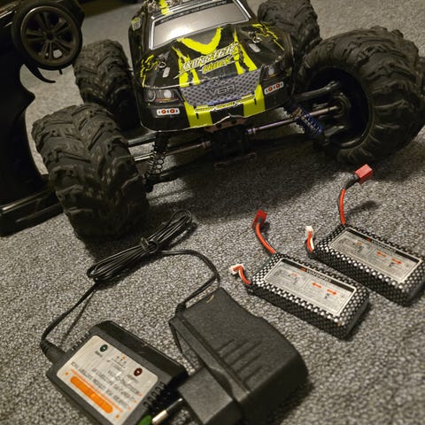 Selges med 1 stk LiPo Batteri og 2 stk NiMH batterier med lader (For å bruke bilen med disse batteriene må endres kontakten mellom regulator og batteri - lett jobb). LiPo lader følger ikke med.