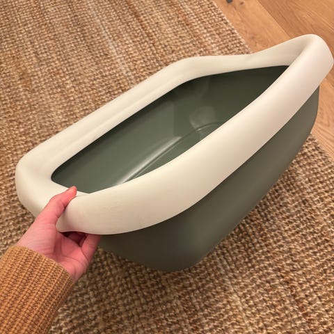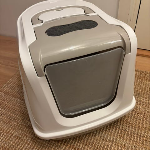 Elegant og stilig kattetoalett med praktisk lokk som hindrer sand i å spre seg rundt i hjemmet.