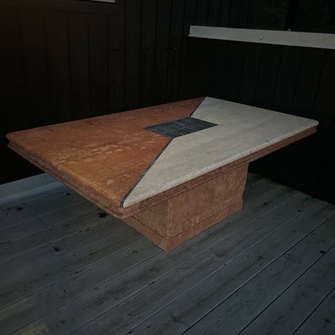 Selvlaget sofabord med betongstamme og vildmarksplate.