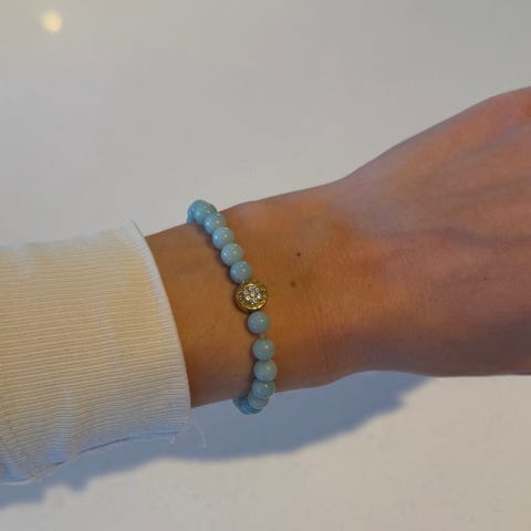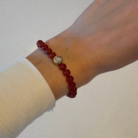 Fint armbånd fra Dyrberg Kern med dusrosa "perler". Det er tredd på kraftig strikk, så kan passe de fleste, indre omkrets måler ca 17,5cm.