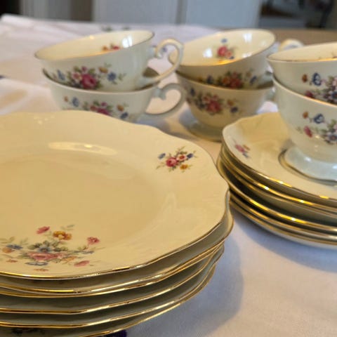 Vintage, klassisk kaffeservice fra 1950-tallet fra PP Porsgrund Porselen / Porsgrunn / Porsgrunds Porselænsfabrik med kant trolig av polérgull. Jeg vet dessverre ikke hva designet eller mønsteret heter, men mener å ha sett navnet Nektar knyttet til dette ...?