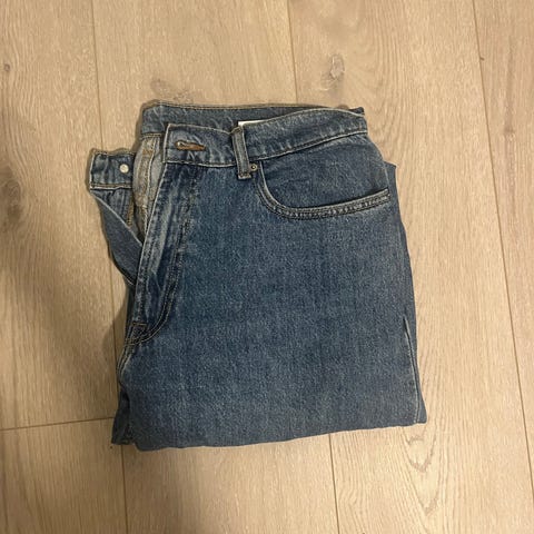 Lite brukt jeans i kraftig stoff i 99% bomull, 1% elastan. Buksen har knapp og glidelås i front.