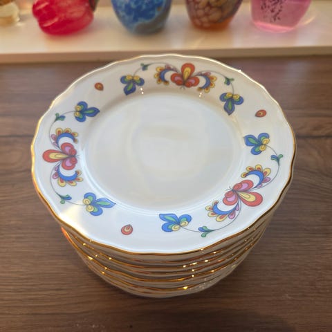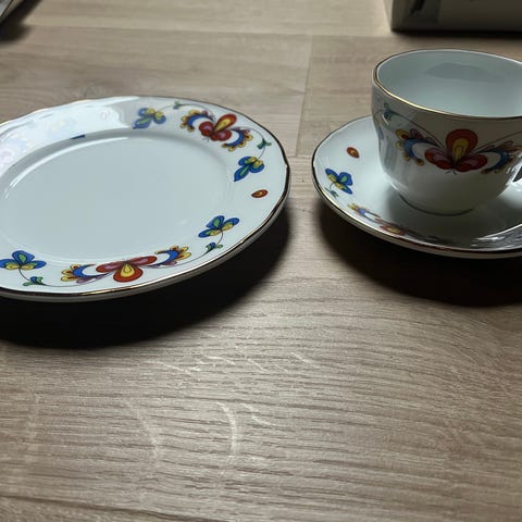 Bondemønster middagsservise. Inneholder 16 stk middagstallerkner (24 cm), 16 stk suppetallerkner (20cm), 2 stk serveringsfat, 1 potetskål, 1 stor skål, 2 medium skåler, 2 små skåler, 1 stor ildfastform og 1 liten ildfastform. Selges samlet for 5000 kr. Må hentes på Heimdal.