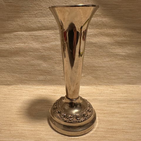Nydelig Vintage Vase i sølvplett produsert i England..høyde 14cm diameter oppe 4.5cm diameter nede 6cm..tung og solid..til små blomsterbuketter på festbordet..se bilder..samsender ved flere kjøp..selger ikke med fiks ferdig