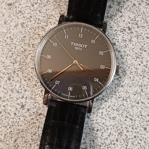 Den holder tiden greit, men er nok moden for en service. Det har gått av et skall på kronen og det er lite lume igjen på visere. Lenken er nok av nyere dato, men her er jeg usikker.