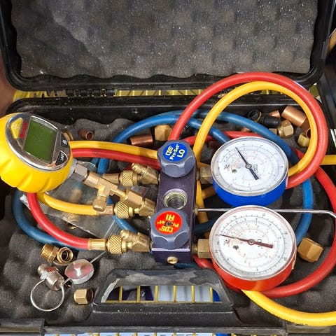 Selger 4stk kofferter med manometer og slanger. Kjøpt hos Moderne Kjøling. Selger alle 4stk under ett.