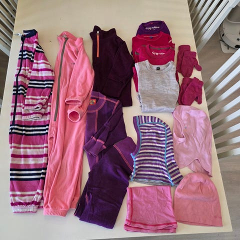 Mellomlagsull til jente. Står størrelse 92 i plaggene, men vil si det er mer 86/92. Ulljakken er fra Ulvang, modell 'flint'. Brukt av ett barn. Ullbuksen er fra merket Leketøy. Mangler snor i midjen(pynt), men har ingenting å si for bruken, da det er strikk i livet.