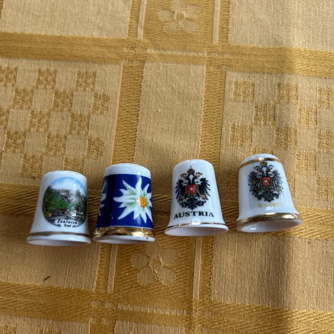 Samling med 29 stk fingerbøl i porselen. Forskjellige bygninger og plasser. Pris kr 22 til kr 80 pr stk. ( 1 stk blå i harpiks SOLGT). SAMLET kr 540. Sendes mot porto både brev, liten pakke og større hvis behov.