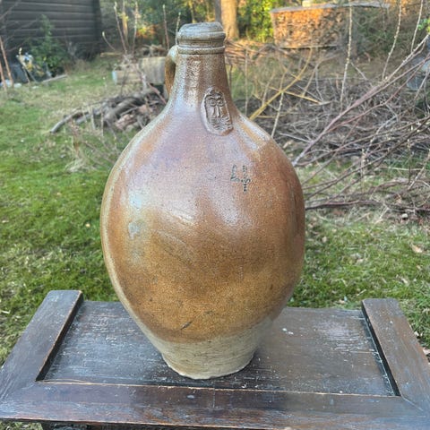 Et antikk steintøy fra Gin-bryggeriet Hulstkamp Zoon & Molyn, Rotterdam, i saltglasert steintøy som har blitt brukt til å lagre Gin. De er alle unike og inneholder alderstegn, men de er i vakker stand og det karakteristiske håndtaket eller "øret" er fortsatt i god form.