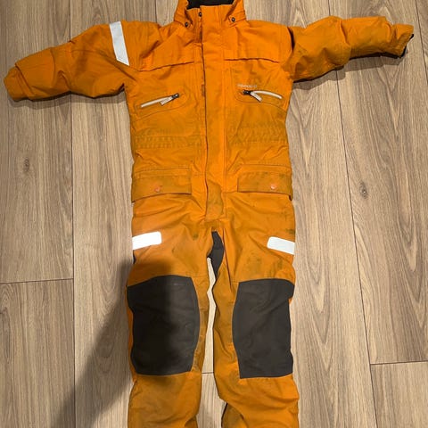 Vinterdress i str 120. Brukt 1 sesong. Ene benet er tråkket på, men har ingenting å si for bruken. Og bruksmerker på knær og rumpe.