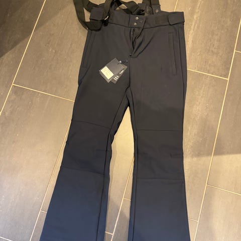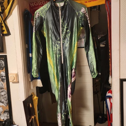 Nesten ubrukt slalomdress som har tilbrakt de siste årene innerst i skapet og ikke fått vært ute i bakken. Jakken str 48 (Frankrike/Italia) , buksen str 50 (Frankrike/Italia) En drøss med kjekke lommer. Avtagbar hette. Glidelås opp hele buksebenet utvendig.