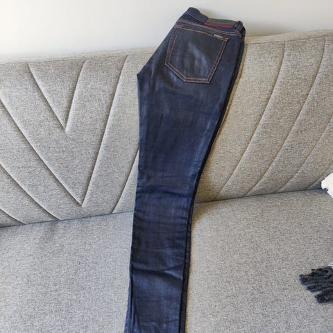 Svarte smale coated jeans fra Hugo Boss str 27/34. Har en flekk øverst på høyre ben - veldig subtilt. Har tatt bilde slik at den skal synes mest mulig.