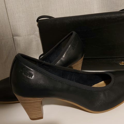 Litt stor clutch veske og et par sko med litt høye hæler. Stilig metallic sølv farge som matcher. Begge er brukt kun noen få timer en kveld. Kan sendes med postnord utenom for 69,-