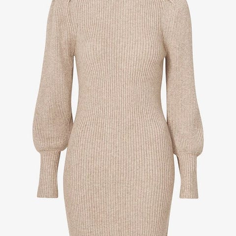 Strikket, elegant stripete kjole med lange armer med dekorative, gullfargede knapper på ermene.
