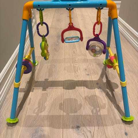 Morsom, fargerik babygym med flere flyttbare opphengsmuligheter. 2 rangler følger med, begge med lyd (bjeller) i seg. Både teppet og lekene er vasket på 60 grader. Ingen flekker eller skader.
