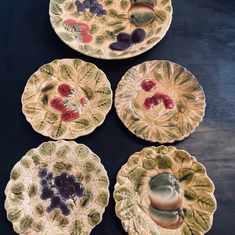 Gammelt ikonisk frukstservise i art nouveau-stil fra den franske fajanse-produsenten Sarreguemines. Seks feilfrie majolika-asjetter og ett stort serveringsfat fra begnnelsen av 20-tallet med fruktdekor. Denne gruppen viser bilder av eple, jordbær, kirsebær, plomme, pære og druer. Det store fatet viser alle fruktene samlet, og er nummerert nr 3924. Kanten følger bladformen.
