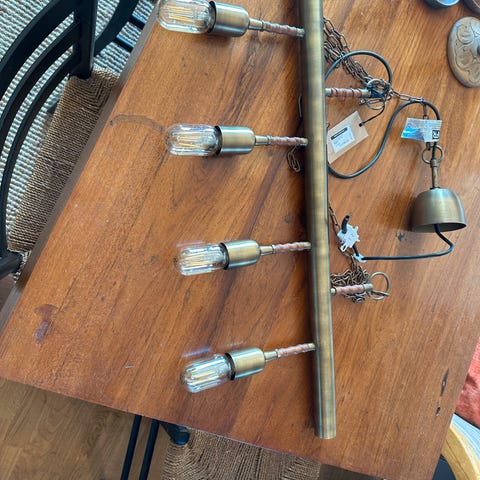 Pen taklampe til å ha over bord eller benk. Må hentes. Fastpris.