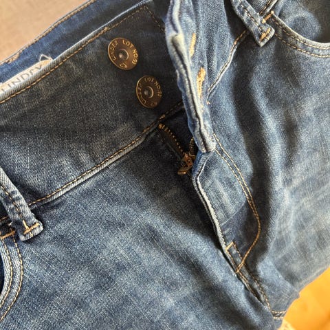 Pent brukt kort jeans shorts i myk denim. Med knapp og glidelås i front. Oppbrett rundt lår trenger å strykes på plass.