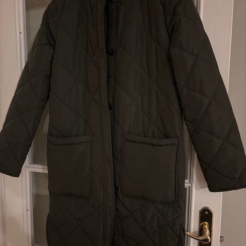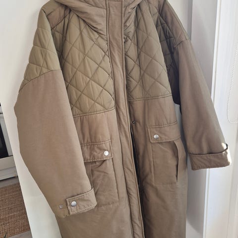 Vattert kåpe i boblestoff i Part Two, grå/beige, str L, glidelås foran med skjulte trykknapper, lommer i hver side som lukkes med glidelås, pent brukt. Selges kr 400,-